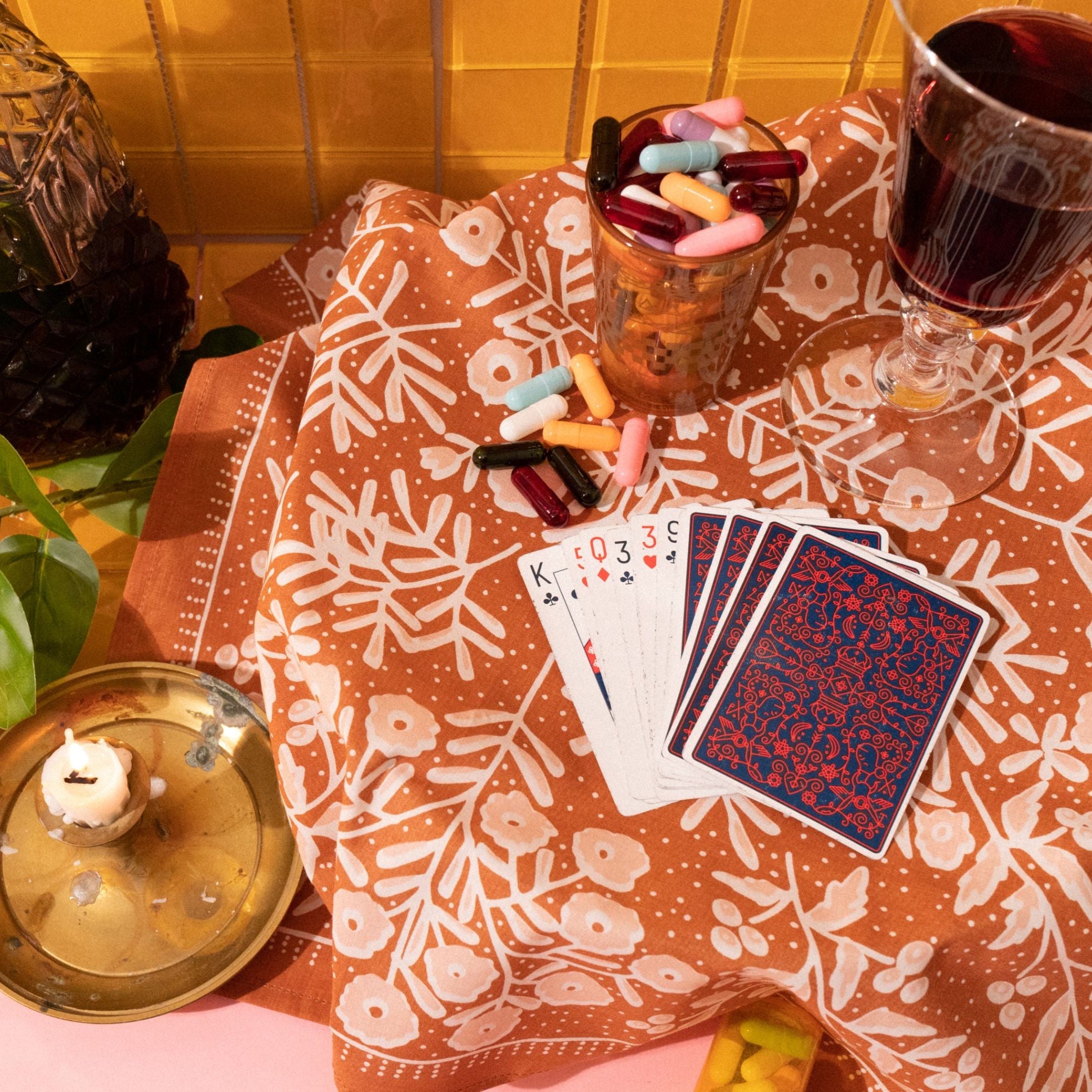 Folksy and unpretentious, Terra’s the friend who’s never going to color her hair–and she’ll never need to, because she’s completely lit up from the inside. Terra’s chestnut hue provides a striking backdrop for the sumptuous, symmetrical floral patterning that Handker is known for, and frankly, it’s hard to keep this classic style in stock.